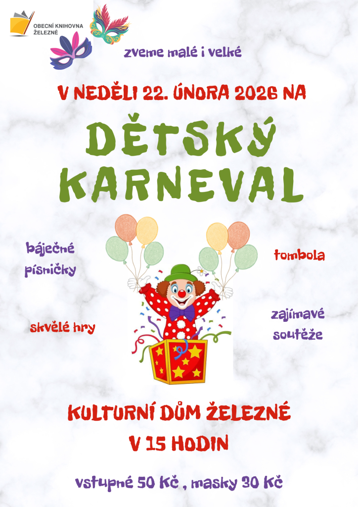 Obecní knihovna Železné srdečně zve všechny malé i velké na Dětský karneval, který se uskuteční v neděli 22. února 2026. Těšit se můžete na tombolu, soutěže, skvělé hry a zábavné písničky. Akce začíná v 15 hodin v Kulturním domě Železném. Vstupné činí 50 Kč, vstup pro masky je 30 Kč.