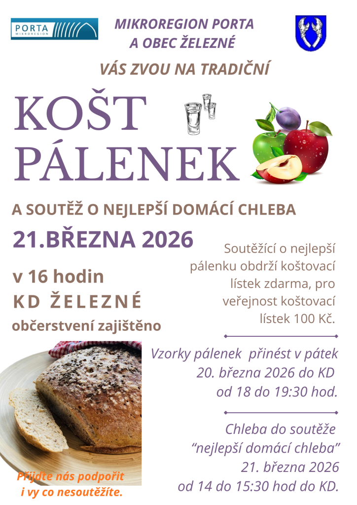 Mikroregion Porta a obec Železné vás srdečně zvou tradiční "košt pálenek". Akce se koná 21. března 2026 od 16:00 v kulturním domě Železné. Soutěžící o nejlepší pálenku obdrží koštovací lístek zdarma pro veřejnost je koštovací lístek za 100,- Kč.Občerstvení pro všechny je zajištěno. Součástí koštu bude také soutěž o nejlepší domácí chléb a to od 14:00 do 15:30. Pokud se chcete zúčastnit jako soutěžící, přineste svůj vzorek domácího chleba.
