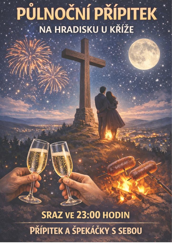 Zveme vás na tradiční půlnoční přípitek, který se uskuteční na Hradisku u kříže. Sraz je naplánován na 23:00 hodin. Nezapomeňte si přinést přípitek, špekáčky a dobrou náladu, abychom společně oslavili příchod Nového roku. Těšíme se na setkání s vámi v kouzelné atmosféře.