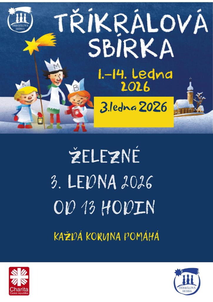 Tříkrálová sbírka se koná 3. ledna 2026 od 13:00 v Železném. Každá koruna pomáhá.
